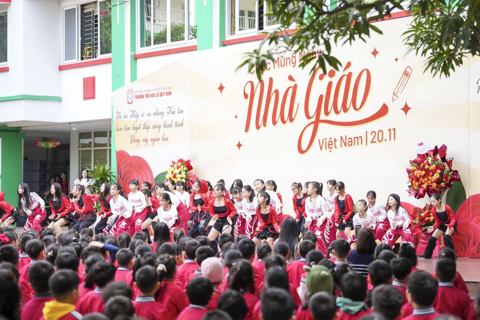 Buổi lễ mở đầu bằng những tiết mục văn nghệ rực rỡ sắc màu, mang đến bầu không khí hân hoan và tươi trẻ. Các em học sinh dành tặng Thầy Cô những lời chúc chân thành, những đóa hoa tươi thắm, thể hiện lòng biết ơn với những người đã luôn dẫn dắt, truyền cảm hứng và đồng hành cùng các em mỗi ngày.