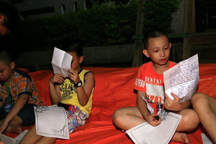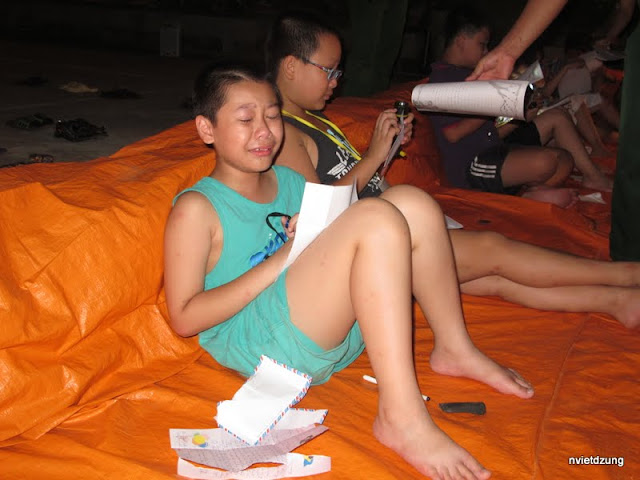 Chuyên đề GIÃ TỪ SỰ GIAN DỐI cũng chỉ đơn giản giáo dục các con về sự khác biệt của những lời nói dối, câu chuyện 8 LỜI NÓI DỐI CỦA MẸ đã làm các bạn nhỏ xúc động dạt dào và nhớ Mẹ da diết. Cuối cùng thì, người mẹ nào cũng như nhau nhỉ? Hết lòng vì con, sẵn sàng nói dối cũng vì con… còn lời nói dối của các con thì sao nhỉ? Nó khác gì với lời nói dối của Mẹ? Ngày hôm nay các bạn í thật thà và thương mẹ rất nhiều, tự thấy mình thật có lỗi với bố mẹ… bạn Trung Đường thì bảo nói dối 5 lần, bạn Tùng Lâm thì khoảng 7 lần, có bạn nói 2 lần, còn lại đa số là khoảng trên dưới 20 lần. Bạn Nhật Anh thú nhận con nói dối 15, mẹ đang uh ah về sự chân thành của con thì con còn chân thật hơn cả mẹ nghĩ: 15 lần trong năm nay mẹ ạ hihi… Chả có bạn nào trong giây phút cảm xúc dạt dào mà lại từ chối rằng mình không nói dối cả. Tờ giấy trắng được vạch những vạch than đen tượng trưng cho mỗi lần nói dối sau đó sẽ vò lại cho vào lửa đốt đi, từ hôm nay các con sẽ trở thành người con ngoan của bố mẹ, sẽ lại từ đầu để phấn đấu làm con ngoan, trò giỏi mong bố mẹ vui lòng. Trong những lá thư viết trong nước mắt gửi bố mẹ, các con đã biết những điều mình đã làm sai, đã biết yêu thương, quan tâm hỏi han bố mẹ… đấy là những cái được trước mắt mà ít ra các con đã nhận được trong chuyến đi này. Để thay đổi con dài lâu, còn là cả sự duy trì thói quen tốt cũng như cách ứng xử của mẹ cha. Hầu như bạn nào cũng viết thư rất dài, vừa viết vừa khóc vì ân hận, vì nhớ nhung và vì yêu thương dạt dào… đặc biệt là với các bạn trai thường rất lười viết và lười suy nghĩ. Phút giây xúc động qua đi, được viết ra những áy náy trong lòng, được kể lể những điều ấp ủ các bạn nhỏ của chúng ta sẽ ngủ một giấc ngủ không mộng mị, thật sự là một giấc ngủ trẻ thơ trong sáng như tờ giấy trắng mà các con được giáo dục trong buổi tối ngày hôm nay. Nhìn những đứa con đang khóc mếu khác hẳn những lúc vui đùa ầm ĩ, nhẩy nhót quay cuồng những anh chị ĐPV và TĐT như cảm thấy 4 ngày trôi qua thật nhanh quá, những chiến sĩ thân thương vừa kịp thân quen lại đã sắp chia tay. Bao vui, buồn, hờn, giận của các bạn í chỉ 4 ngày mà đã như thân quen lắm, giờ ngồi lại trong màn đêm mới thấy nhớ, thấy thật buồn nếu phải chia tay…
