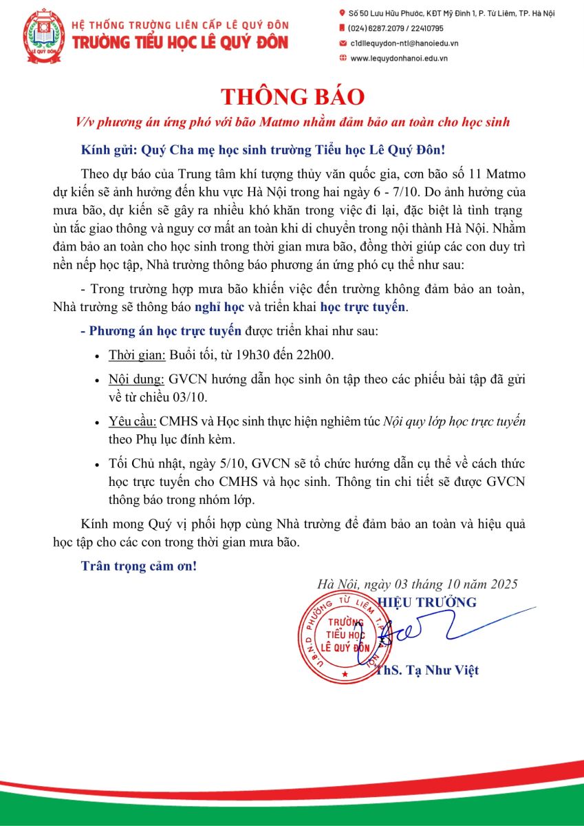 Theo dự báo của Trung tâm khí tượng thủy văn quốc gia, cơn bão số 11 Matmo dự kiến sẽ ảnh hưởng đến khu vực Hà Nội trong hai ngày 6 - 7/10. Do ảnh hưởng của mưa bão, dự kiến sẽ gây ra nhiều khó khăn trong việc đi lại, đặc biệt là tình trạng ùn tắc giao thông và nguy cơ mất an toàn khi di chuyển trong nội thành Hà Nội. Nhằm đảm bảo an toàn cho học sinh trong thời gian mưa bão, đồng thời giúp các con duy trì nền nếp học tập, Nhà trường thông báo phương án ứng phó cụ thể như sau: