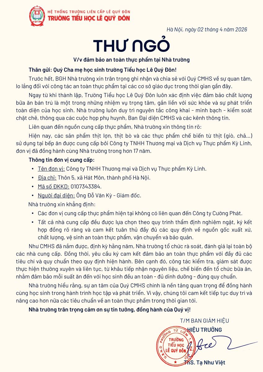 Thư ngỏ V/v Đảm bảo an toàn thực phẩm tại Nhà trường