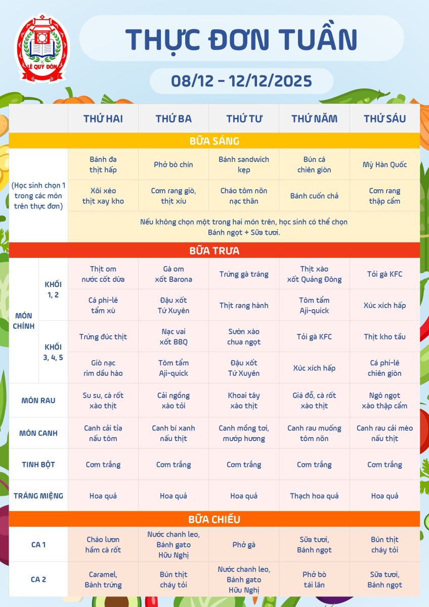Thực đơn 08/12 đến 12/12/2025 | Thực đơn | Trường Tiểu học Lê Quý Đôn