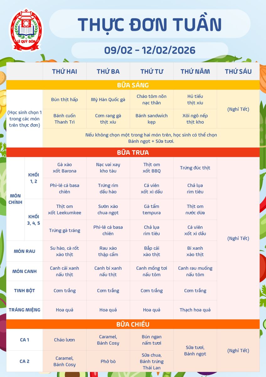 Thực đơn 09/02 đến 12/02/2026 | Thực đơn | Trường Tiểu học Lê Quý Đôn