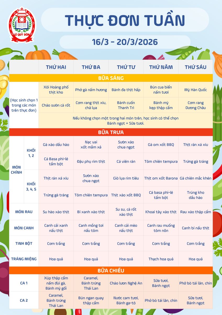 Thực đơn 16/3 đến 20/3/2026 | Trường Tiểu học Lê Quý Đôn
