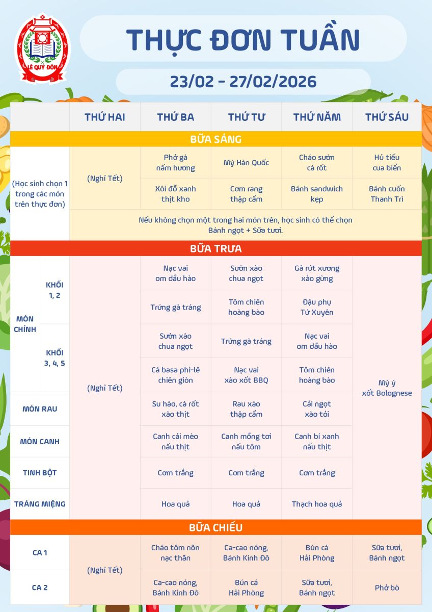 Thực đơn 23/02 đến 27/02/2026 | Thực đơn | Trường Tiểu học Lê Quý Đôn