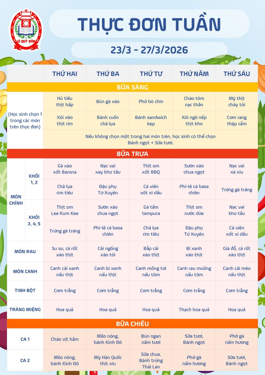 Thực đơn 23/3 đến 27/3/2026