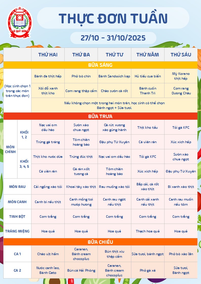 Thực đơn 27/10 đến 31/10/2025 | Thực đơn | Trường Tiểu học Lê Quý Đôn