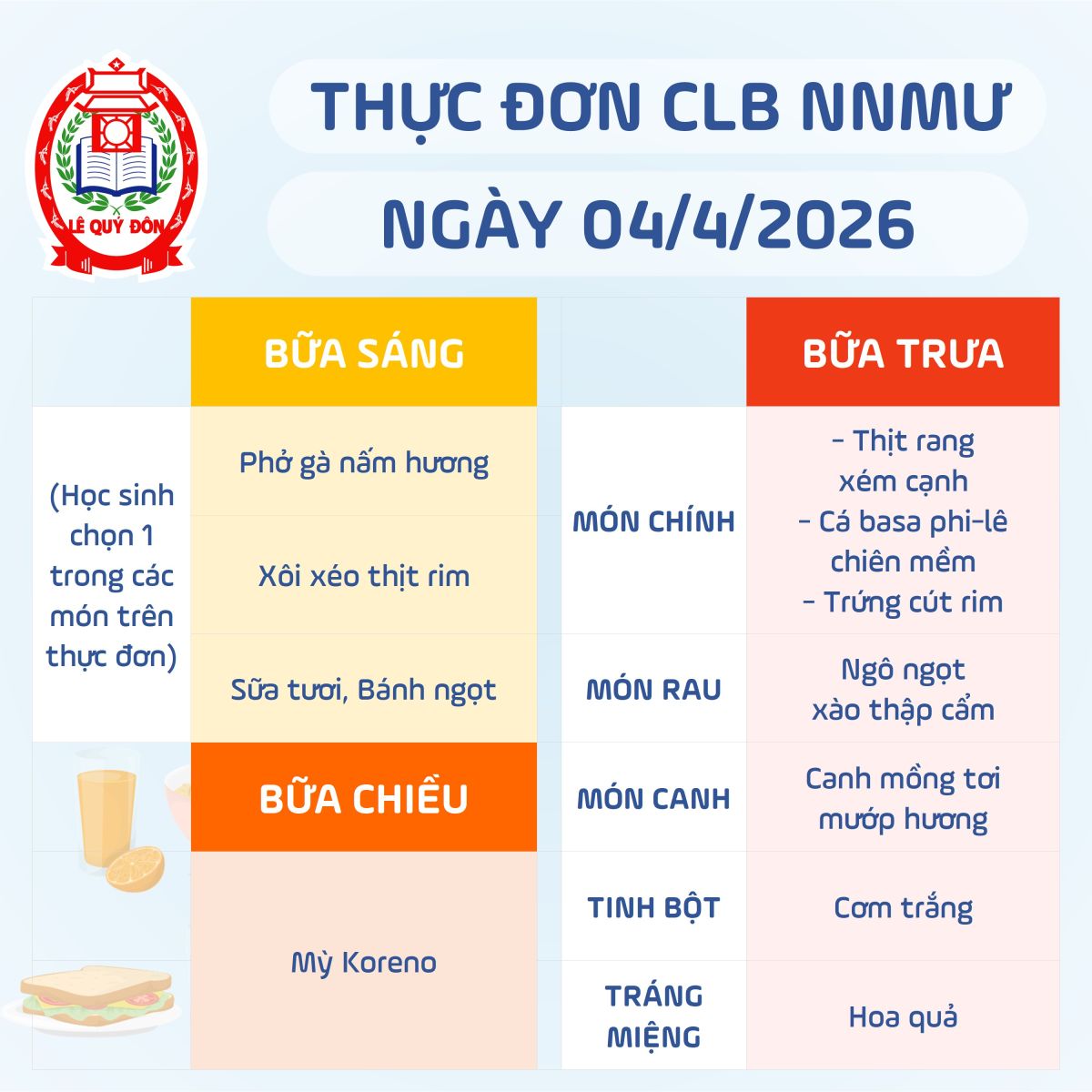 Thực đơn CLB Ngôi nhà mơ ước 04/4/2026