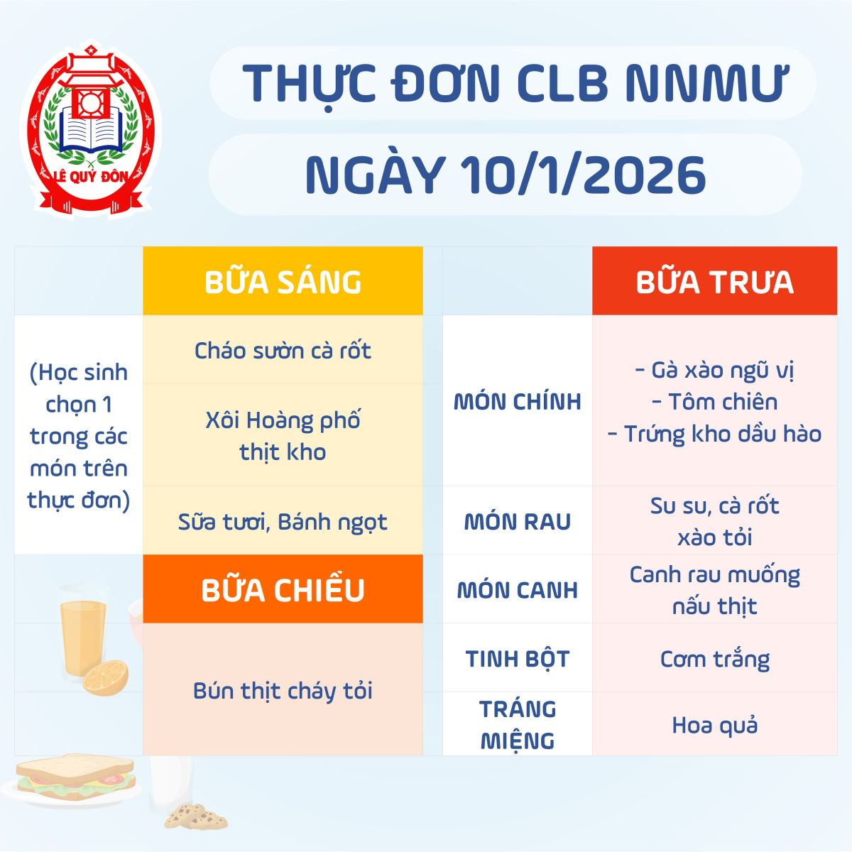 Thực đơn CLB Ngôi nhà mơ ước 10/1/2026