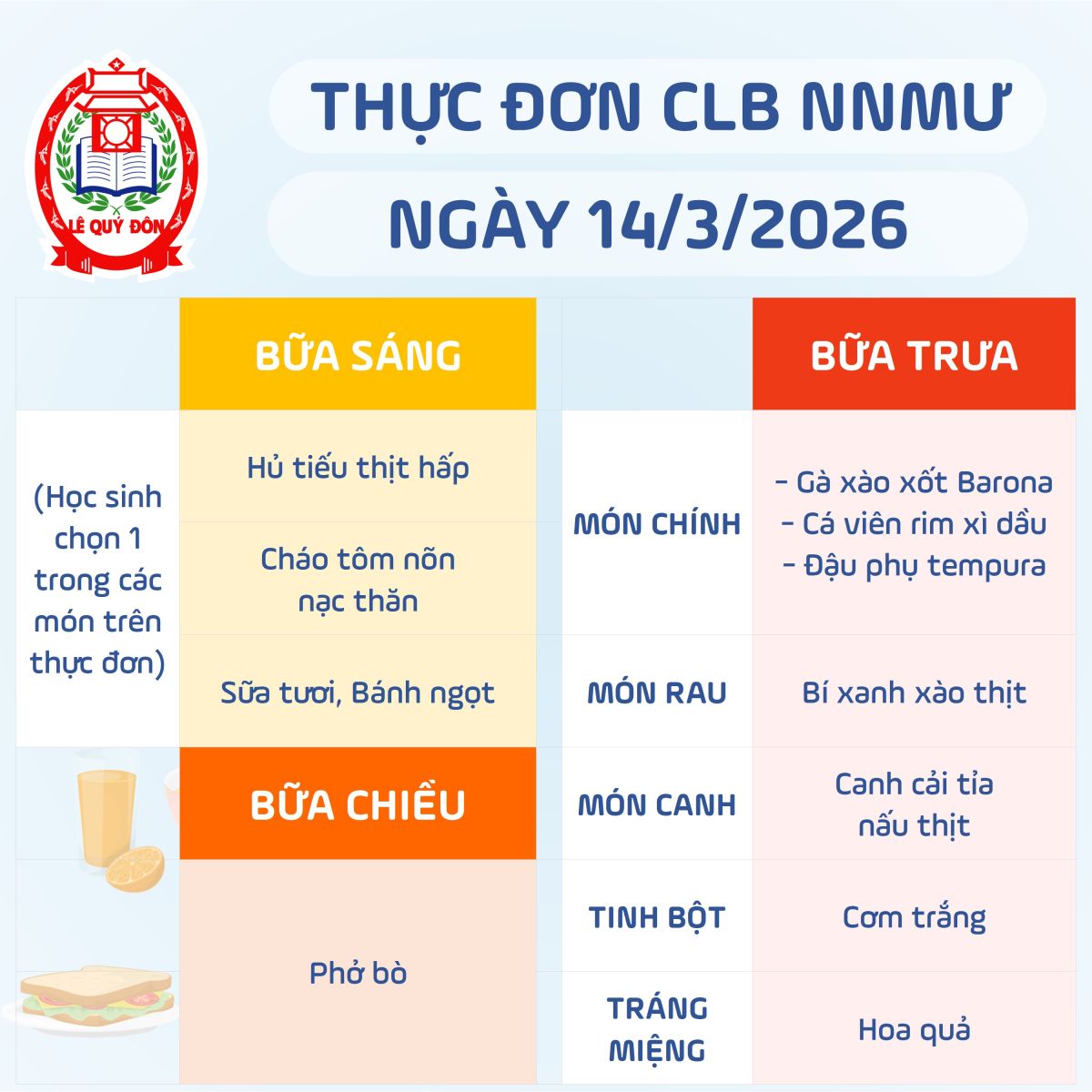 Thực đơn CLB Ngôi nhà mơ ước 14/3/2026 | Trường Tiểu học Lê Quý Đôn