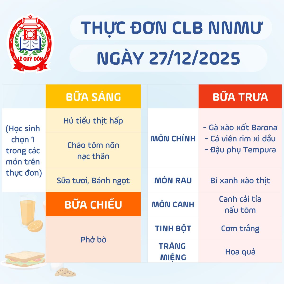 Thực đơn CLB Ngôi nhà mơ ước 27/12/2025