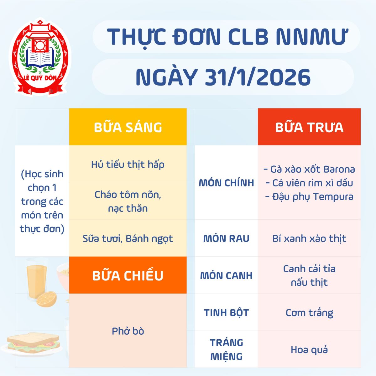 Thực đơn CLB Ngôi nhà mơ ước 31/1/2026